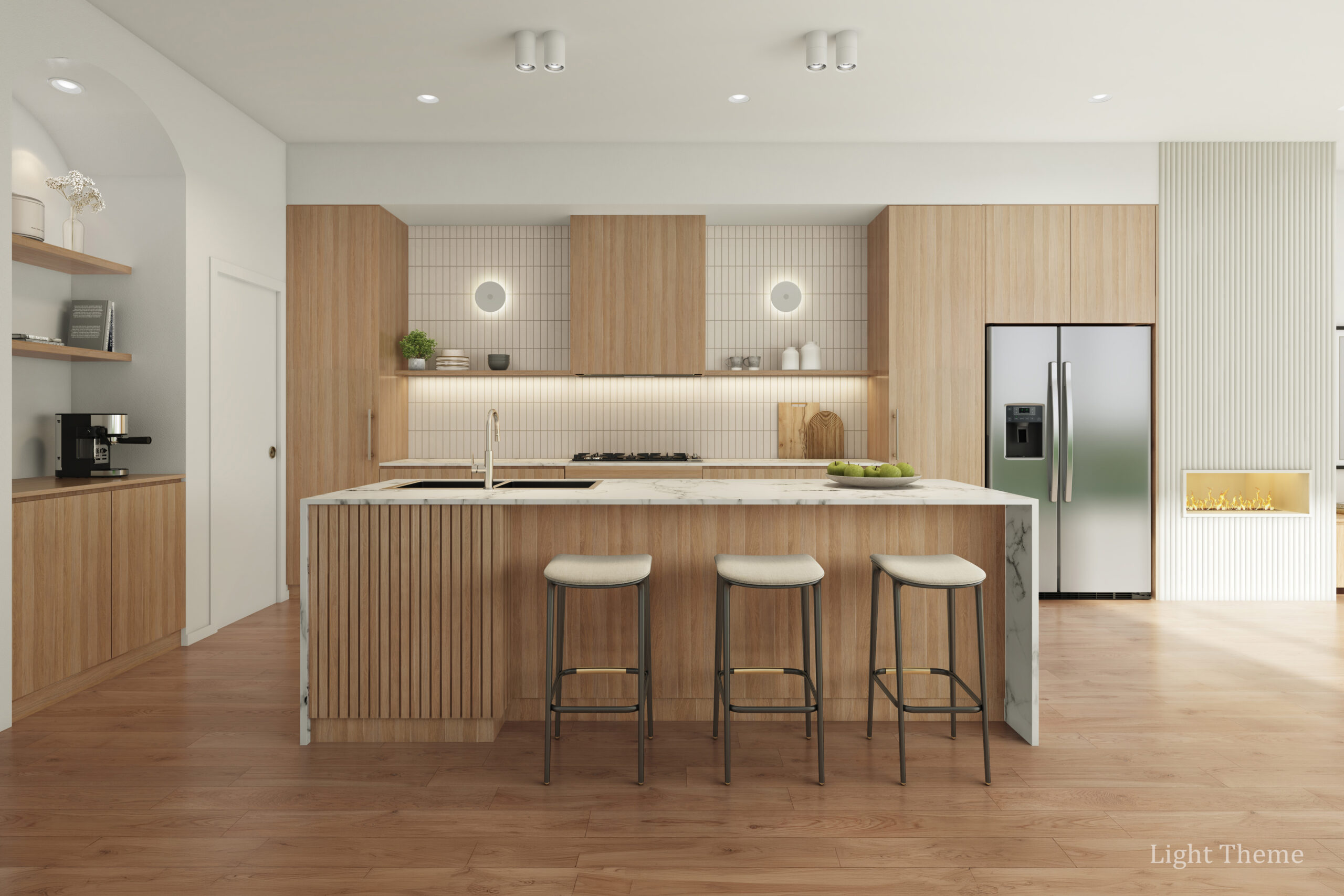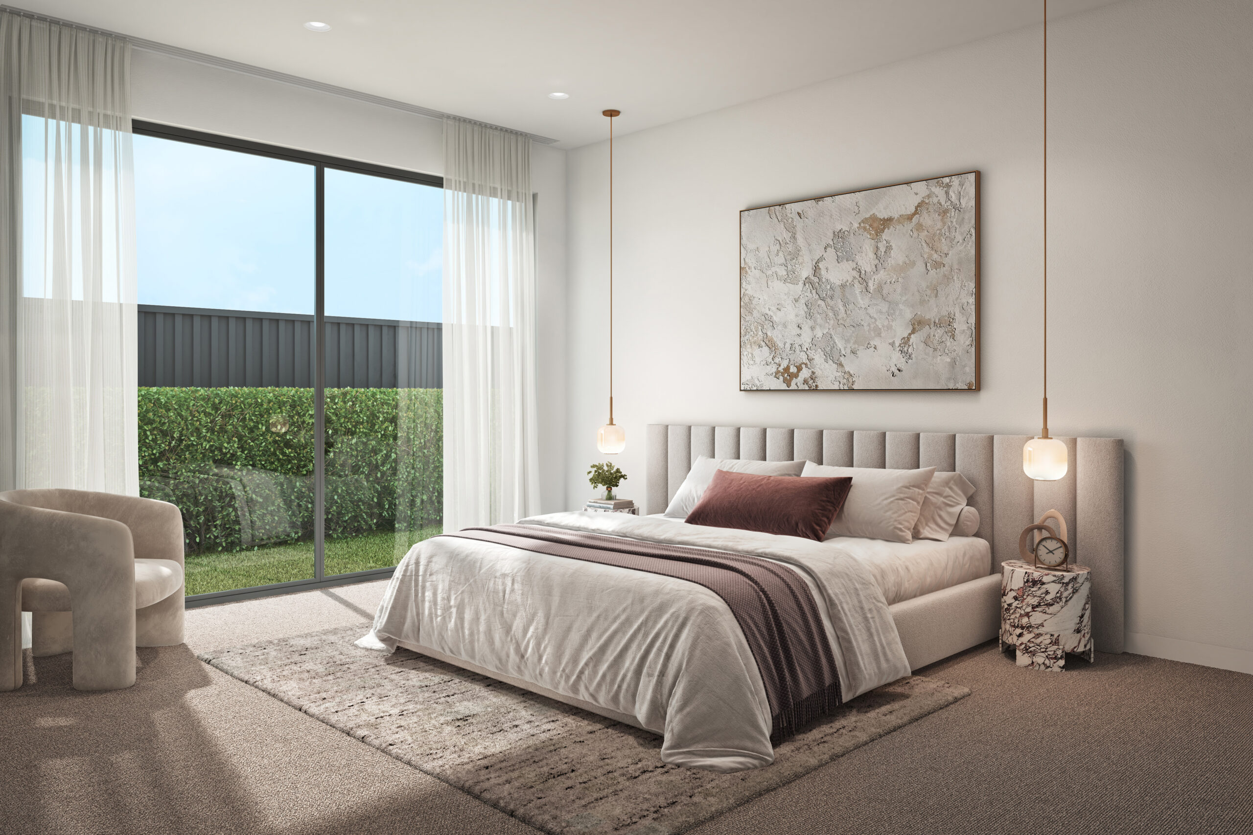 From the street, the homes present a confident yet elegant presence. Clean upper-level forms are softened by graceful curves and striking arched windows, while textured stone, warm vertical timber battens and crisp rendered finishes create depth and visual interest. Subtle integrated LED strip lighting enhances the clean lines after dark, casting a soft ambient glow that elevates the façade’s presence. The balanced composition ensures a streetscape that feels refined, welcoming and enduring.